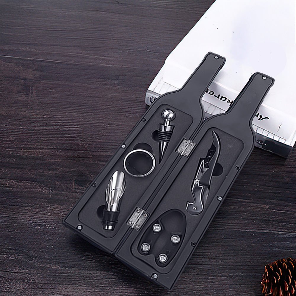 - 內容物:開瓶器×1、倒酒器×1、紅酒塞×1、割箔刀×1、收納瓶身×1